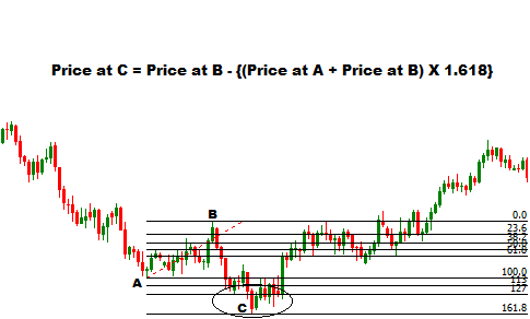 In some cases 161.8% fibonacci retracement level of small moves also counted depending on the situations e.g. at the end of an impulsive five waves pattern. We can find the price at 161.8% fibonacci retracement level using the following formula Price at C = Price at B - {(Price at A + Price at B) X 1.618}, if we want the find the fibonnaci retracement level without retracement tool.